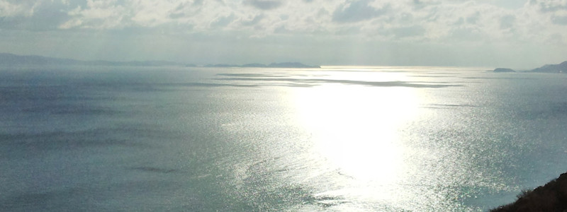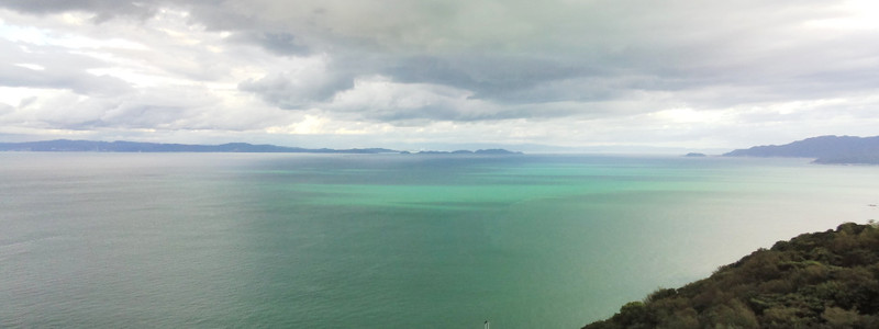 望楼から紀淡海峡を臨めば、エメラルドグリーンが海面を広範囲に染める。