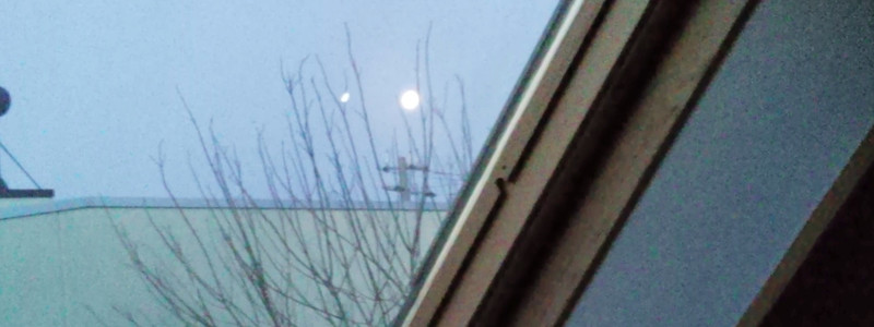 十五夜の翌朝、天窓に名残の月が冴えた空に、