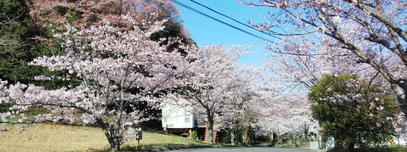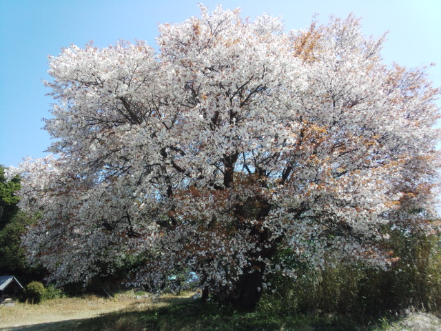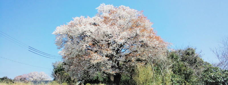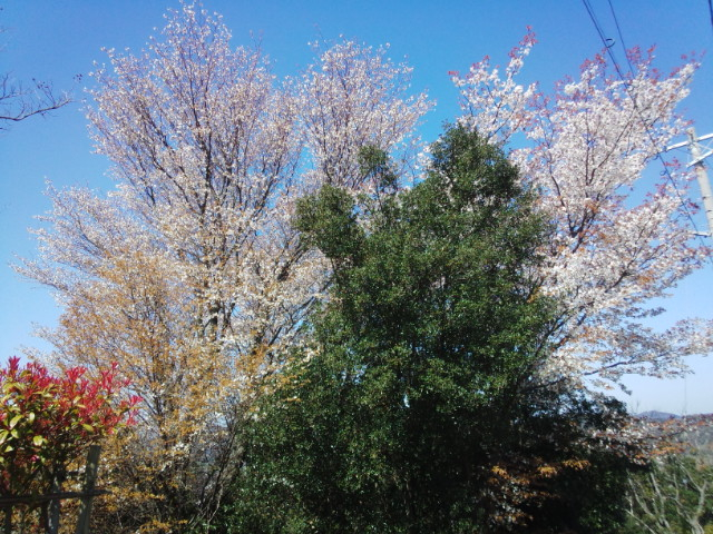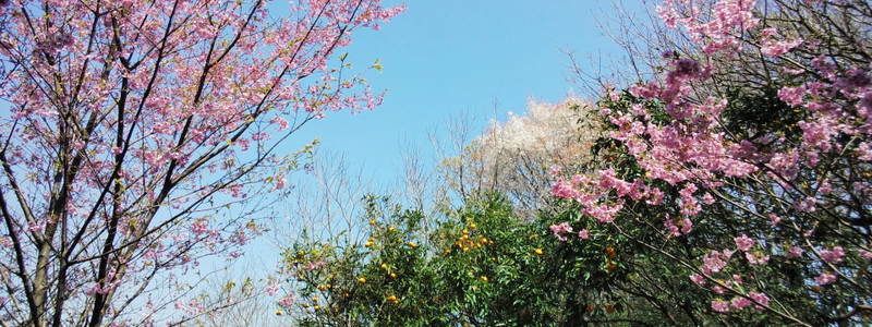 愉悠舎前の緋寒桜(ピンク色)に山桜(後方の白っぽい色)、そして淡路島文旦(柑橘類)も今が盛り
