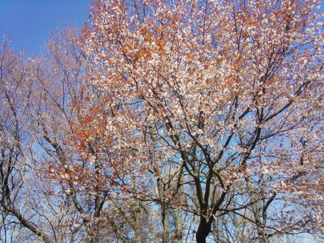 満開の山桜、ソメイヨシノの陰で、緋寒桜が散り初めている。