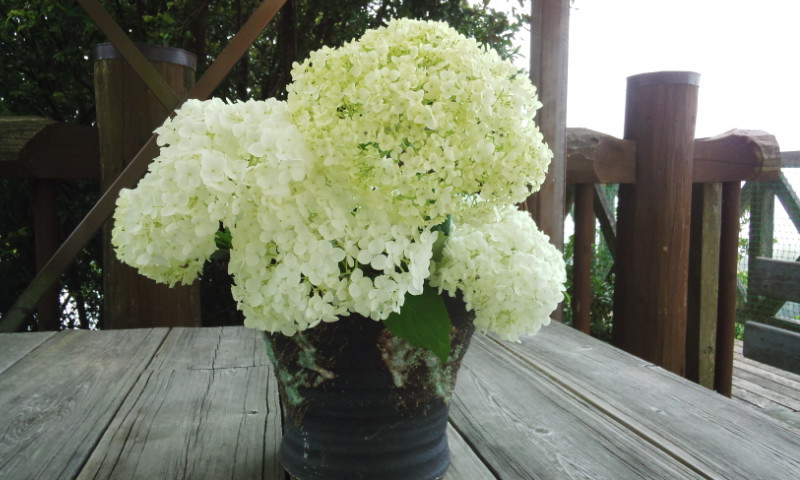 自宅の庭で咲かせた西洋アジサイ(上、画像)を持って。