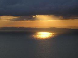 今朝7時ごろ対岸の山陰に薄日が射し込んだ、デジカメを持って待受けたが、雲の間から丸い太陽の挨拶はなかった。