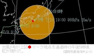 台風が淡路の南沖、室戸岬と和歌山の潮岬を結ぶあたりを通過しているとき、淡路島の上空に虹が懸かった。「台風の目」に入ったのだろう。