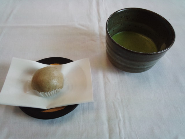 その後、用意された茶室でソバ饅頭をお供に抹茶をたしなんだ。
