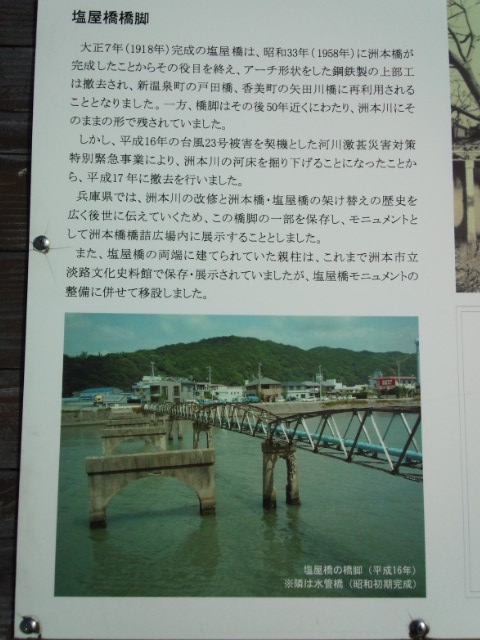 塩屋橋は兵庫県に現存する一番古い鉄橋で、唯一のポニートラス橋である。塩屋橋は旧・洲本橋の架設に伴い兵庫北部に移され、今は故郷淡路島の県立淡路島公園で人々の心を和ませている。(2002年