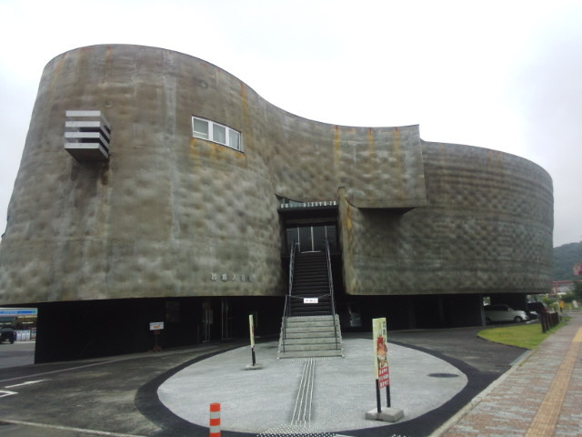 帰路福良港の「道の駅」に寄ったついでに、2年前オープンした淡路人形座新館(人形浄瑠璃館)を外から眺めた。鋼メッシュを外装に使った曲面の建物は人形浄瑠璃の黒子を彷彿させ、見る者の目を奪う。