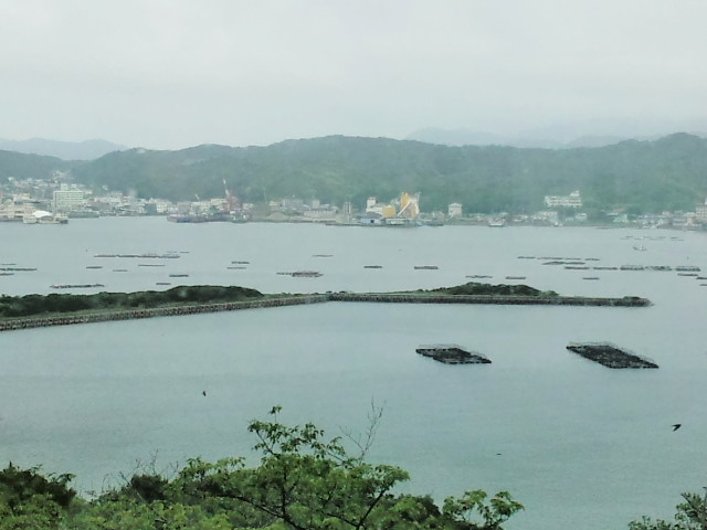 2階のレストランから福良湾が望め、観潮船の着く波止場や「3年とらふぐ」の養殖場が見える。