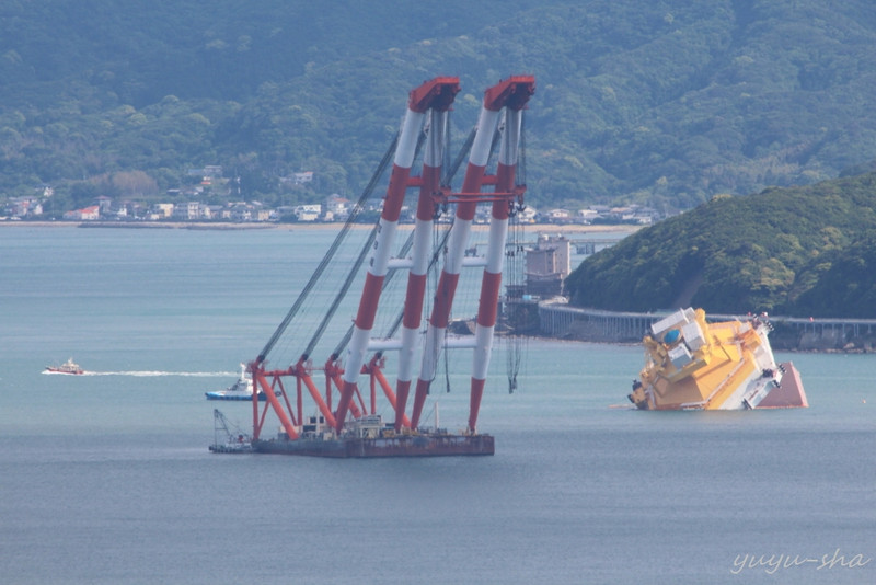 洲本沖で工事中の風力発電設備の土台が姿を消しているように見えた。よくみると大きく傾むき、半分ほど海中に姿を隠していた。