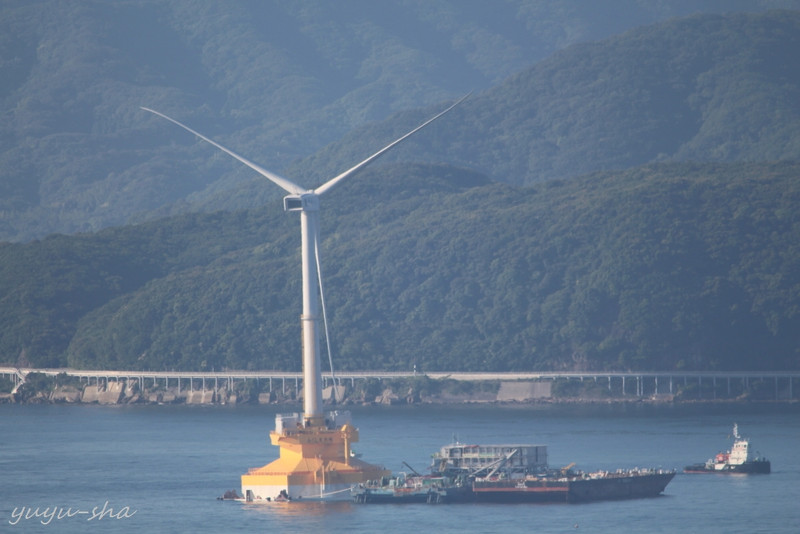 浮体の上に建つ塔は85m、一枚の羽根の長さが60mの大きな風車。