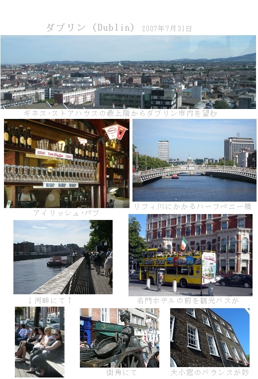 「ダブリンの街角で」というアイルランド映画が昨年日本で公開された。ダブリンのグラフトン・ストリートで出会った、ストリート・ミュージシャンとチェコからの移民女性が音楽を通して知り合い、音楽に夢を育む物語である。映画に出てくるダブリンの街角は哀愁に沈んでいたが、訪れたダブリンは夏の真っ盛り、暑くもなく寒くむもない快適な夏を満喫する人々は、リフィ川のほとりをそぞろ歩く。ベンチに腰をかけながら川面に目をやる女性の膝元が眩しい。