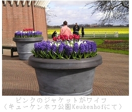昨年、一昨年とオランダを訪れる機会を得た際、ワイフは先ず花のある風景を目指した。一昨年のそれは「キューケンホフ公園」へチューリップを見に行った。アムステルダム中央駅から直通列車に乗り30分ほどでライデン駅に着く。そこからバスで1時間ほどのところにあるその公園は、チューリップの咲く3月下旬から5月のわずかな期間開いている。私たちが訪れたのは4月はじめで、チューリップの開花が始まったばかりであった。それでも32万㎡(甲子園球場の8倍、グランド面積+スタンド面積=約4万㎡)の敷地は、まもなく咲き乱れるチューリップの予感に満ち溢れていた。園内には、チューリップのほか、ヒヤシンス、水仙などの球根花が植わっている。そのほか日本庭園もあったが、私たち日本人の目から見ると、あまり手入れの行き届いた庭に見えなかった。