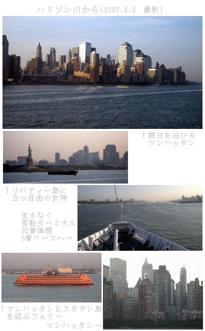 自由の女神が後方に消えるとマンハッタンの摩天楼群が右手にそびえている。昇る陽がビルのガラスを照らし、浴びた陽がハドソン川に落ちる。ニューヨークの朝は摩天楼から明ける。