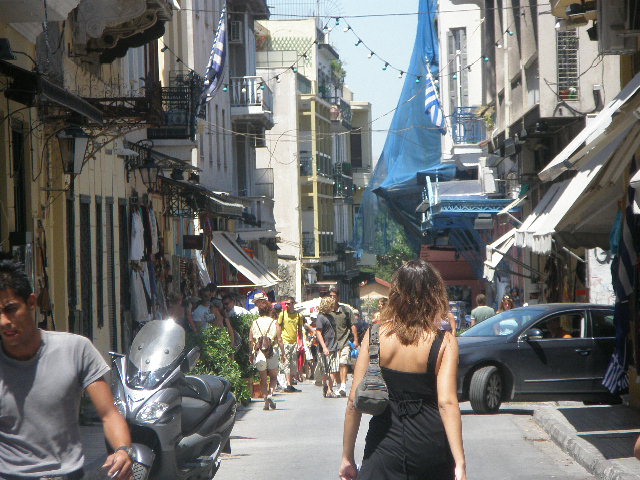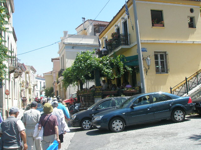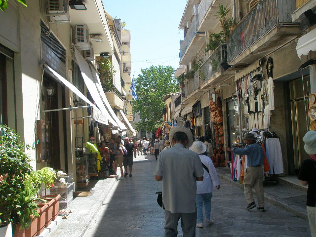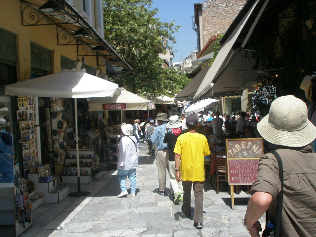 レストランや土産物屋が曲がりくねった道や坂道に軒を連ねている。夜ともなるとライトアップされた街並みに、日本人から見れば遅い夕食をとる観光客や地元の人でごったがえす。ちなみにアテネにおけるこの日の日没は午後8:49分、9時以降人がどっとこのエリアに繰り出す。