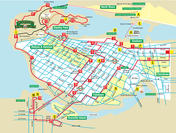 上記ルートマップ②番(Seabus Terminal)から乗り一周した。チケットを買ったとき渡されたルートマップを見ながら、窓外に展開する美しいバンクーバーの街並みを楽しんだ。途中、⑪番ロブソン通り((Robson