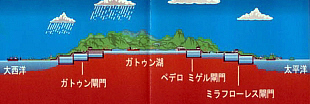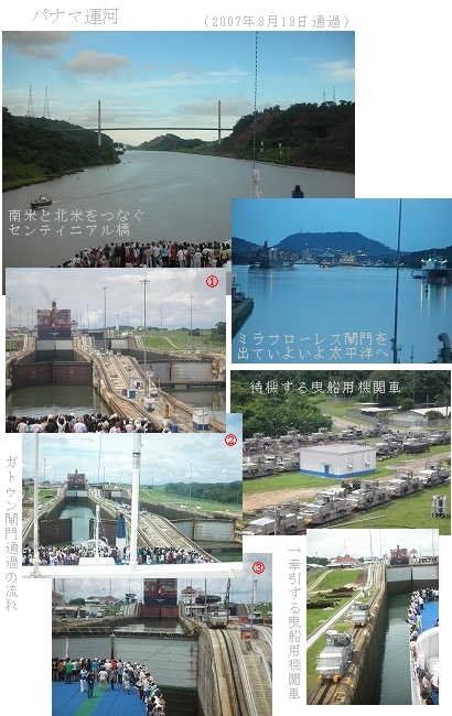パナマのクリストバル港を出たクルーズ船トパーズ号は、カリブ海(大西洋)から水路を抜けパナマ運河に入り、しばらく進みガトゥン閘門(こうもん)に達した。ガトゥン閘門は海面レベルからガトゥン湖の高さ(海抜26m)まで船を上昇するためのもので、三つのチャンバー(chamber)で構成されている。一つのチャンバーの長さは300m、幅は33mある。一段目のチャンバーに船が入ると扉を閉めガトゥン湖から水を注入し9mほど船を上昇させる。二段目のチャンバーと同じ高さになると船を曳船用電気機関車(日本製)で二段目のチャンバーへ進める。二段目、三段目と同じ作業を繰り返し、閘門を出てガトゥン湖に進入する。
