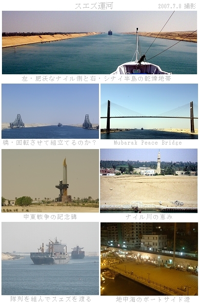 デッキから運河やその両岸を船首デッキに立って眺めていると、目に映るいくつかの風景がある。右舷側のシナイ半島は乾いた土の砂漠地帯が何処までも伸びているのに比べて、ナイル川を有する左舷側は緑が多い、このギャップに戸惑う。岸の所どころに銃を持った兵士が往き来する船を監視している。戦勝記念碑みたいなものも建っている。運河航行も大詰めに差し掛かる頃、両岸をまたぐ大きな斜張橋が目に飛び込んでくる。橋の名を「ムバラク平和橋」と言うらしい、日本からの無償ODAにより日本の企業等が参加して架けたらしいが、ムバラクはエジプトの現大統領であり、ODA事業に国の権力者の名前を冠するのはいかがなものであろうか。