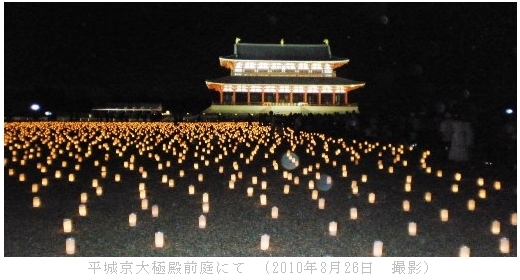デジカメで撮った写真を整理していたら、昨年の今頃奈良の「平城遷都1300年祭」に行った写真が見つかった。風景写真の多くはパソコンから「ゴミ箱」に捨てられる運命にある。1300年祭の一つ、「大極殿院をろうそくの灯りで飾る」イベントを撮った写真を手に、捨てようか残そうか迷った挙句、ブログに残そうと思い立った。・・・思い立つほど大袈裟なものではないが、昨年の今頃は当ブログを休止していたので一年遅れのアップになる。