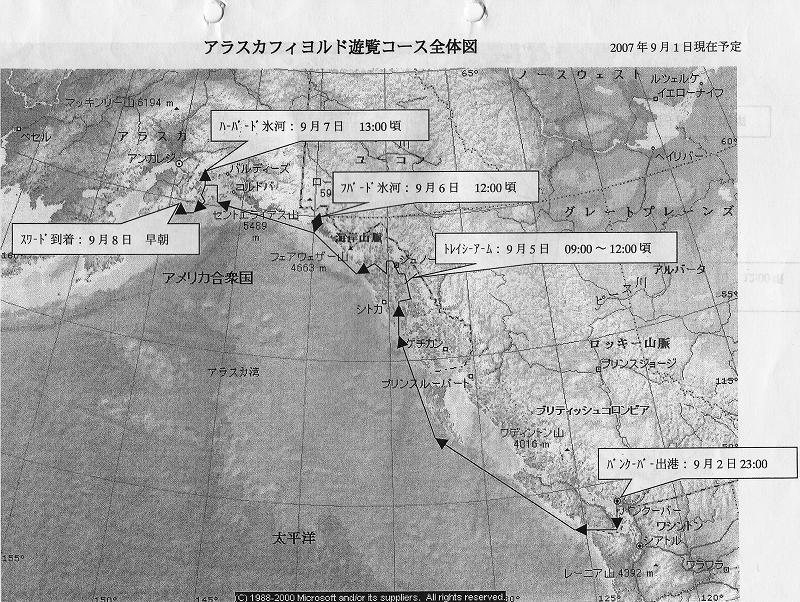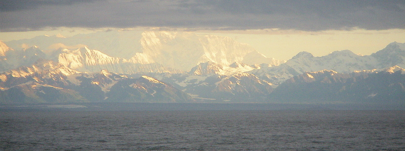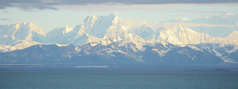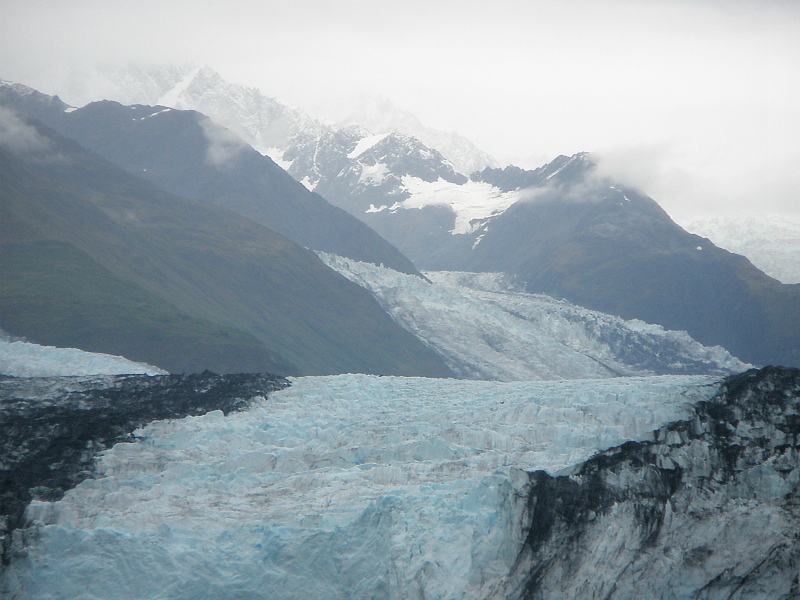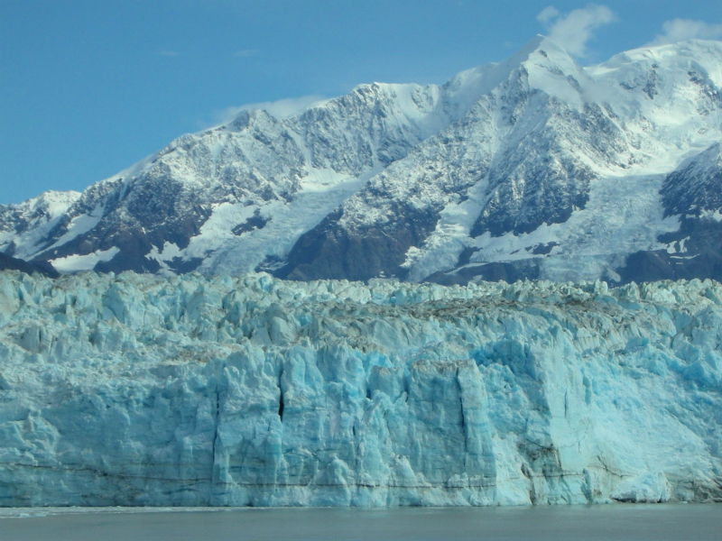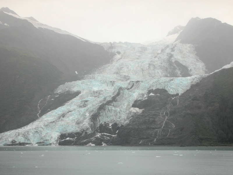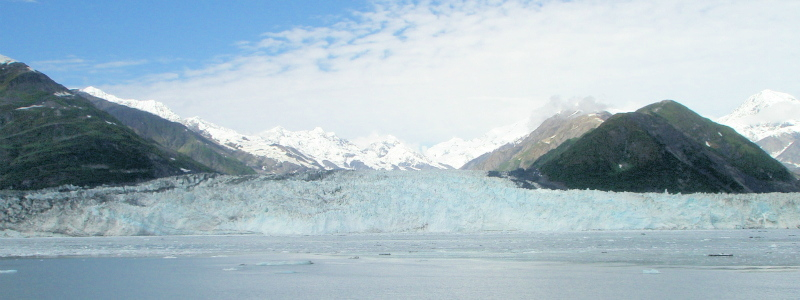 北米大陸の太平洋岸を北上し、アラスカ湾に入ると湾沿いに氷河海岸が点在し、いくつもの氷河が海に流れ込んでいる。