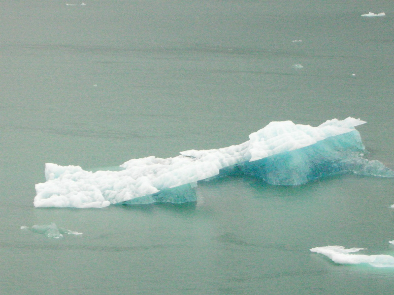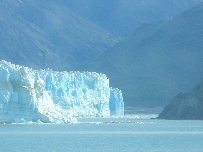 道中、氷を抱いた4000m~5000m級の山々が海岸に迫り、高さ50mは有ろうかと思われる氷山が海面から顔をのぞかせ、細長い氷の柱が延々と続く。時おり海に崩れ落ちる氷山の轟音が胸をえぐる。クリスタルの輝きを見せて飛び散った破片が海面に漂う。