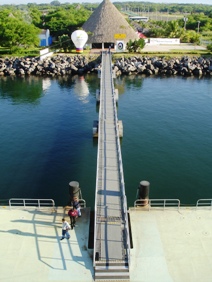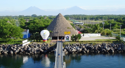 船のタラップを降り、長い橋を渡るとターミナルの施設が待っている。自然素材で造られた施設は背景の山々と溶け合って妙だ。この山々であの「グアテマラコーヒー」が採取されるのだろう。