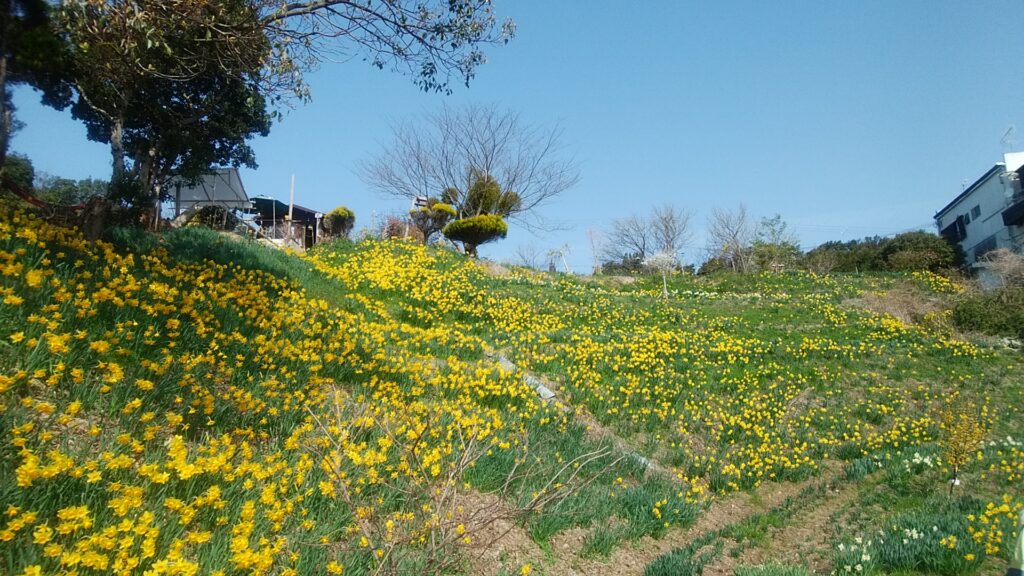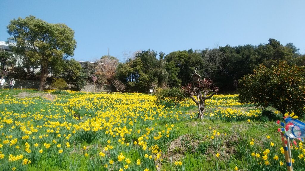 淡路市多賀にある「水仙の丘」はラッパスイセンをはじめ白色のタイハイ(大杯)スイセン、スズランスイセンなど17品種が、丘陵地に広がっており水仙の丘は、丘陵地の斜面が半円状に広がっており、満開のラッパスイセンが一帯を黄色く染めています。円形劇場を彷彿とさせるような地形です。