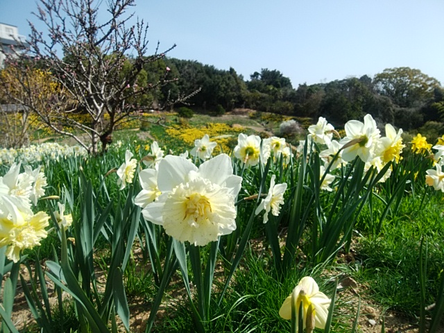 どこからでも園の全貌が見渡せることができ、ところどころに「沈丁花」や「ボケ」そして「黄梅」等の花が散りばめられ、ラッパ水仙に花を添えている。