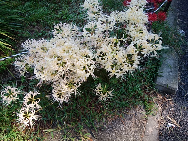 ラジオから流れてきた、「曼珠沙華には赤、黄、白がある」と、その話しをワイフにしたところ、「そうやで、近くに白い彼岸花咲いてるとこある」と云うので、ついでの時に立ち寄った。国道28号に入る手前の路肩に一塊の白い花が、車を停めスマホに収めた。彼岸の日に咲くこの花だが今年はもうさかりを過ぎたのか少しひなび気味