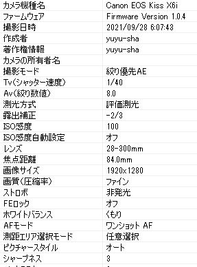 「絞り優先」モードで撮った。イメージとは程遠い。データを解析し、いろいろ考察を楽しもう。「マニュアル」モードの方が良いのかもしれない、初心者には?