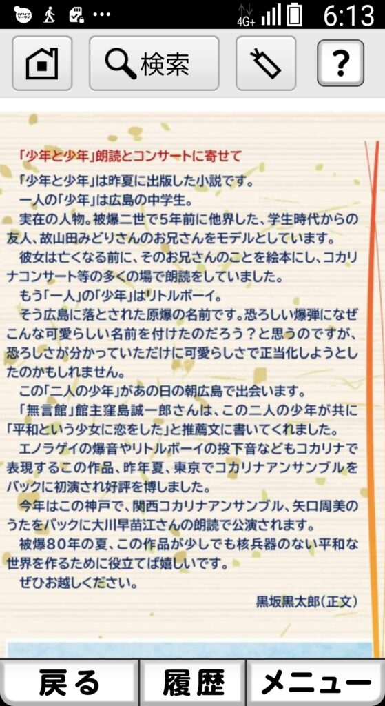 黒坂氏は「少年と少年」は広島の中学生とリトルボーイが出会う話で、昨年夏、日本語と英語で出版され、多くの方が読んで下さいました、と。