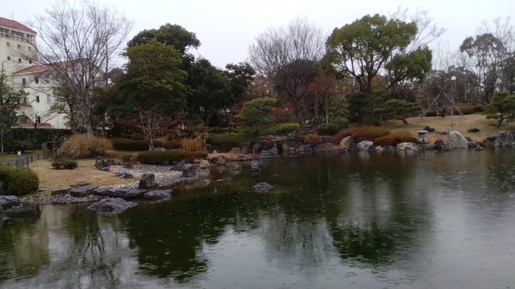 ウォーキングの途中、「日本庭園」へ、冬枯れ近い庭園に漂うのは……。